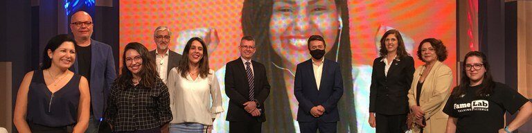 Gabi aparece em telão após ser anunciada como vencedora da etapa brasileira do FameLab.