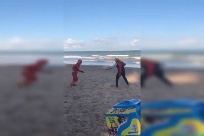 Thor e Flash viram vendedores de picolé e travam batalha em praia na PB