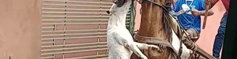 Moradores de um condomínio em Águas Lindas de Goiás, Entorno do Distrito Federal, registraram o momento em que um cão da raça pit-bull atacou violentamente um cavalo. O caso ocorreu no bairro Jardim Santa Lúcia, nessa terça-feira (27/12).As imagens mostram o cachorro pulando em direção à boca do animal de grande porte e dando mordidas. Pessoas que estavam no condomínio na hora do ataque tentaram afastar o pit-bull com enxadas, tábuas de madeira e vassoura, mas sem sucesso.O cavalo, que estava preso a uma carroça, tentou se defender dos ataques, com coices, enquanto o cão continuava o mordendo. No vídeo, é possível ouvir uma mulher gritando por socorro: “Cadê o dono desse cachorro. Mata esse cachorro aí”.Ao Metrópoles, um dos moradores do condomínio, que preferiu não se identificar, relatou que o carroceiro realizava uma entrega quando o pit-bull correu em direção ao cavalo e o mordeu diversas vezes. Segundo o homem, o cão pertencia a outro morador do condomínio, que conseguiu retirar o animal do local.De acordo com o morador, o dono do pit-bull pagou todas as despesas do atendimento veterinário cavalo, que ficou machucado nas patas, focinho e pescoço. Por conta do ataque brutal, o animal precisou levar alguns pontos, mas passa bem.Quer ficar ligado em tudo o que rola no quadradinho? Siga o perfil do Metrópoles DF no InstagramReceba notícias do Metrópoles no seu Telegram e fique por dentro de tudo! Basta acessar o canal: https://t.me/metropolesurgente.Faça uma denúncia ou sugira uma reportagem sobre o Distrito Federal por meio do WhatsApp do Metrópoles DF: (61) 9119-8884.Fonte: Metrópoles