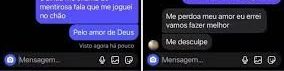 Nas conversas, o homem responde “me perdoe se te machuquei”. Em outro momento, ele diz: “Me perdoa, meu amor, vamos fazer melhor. Me desculpe”.