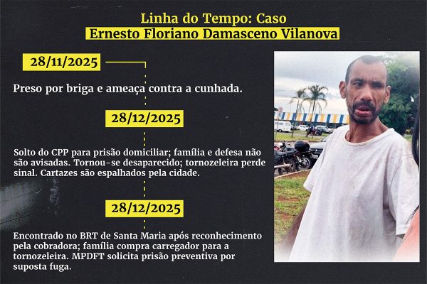 Ernesto foi localizado no BRT de Santa Maria nessa segunda (29/12), quando uma cobradora de ônibus o reconheceu após reportagem publicada pelo Metrópoles. A família conseguiu, então, recarregar a tornozeleira.