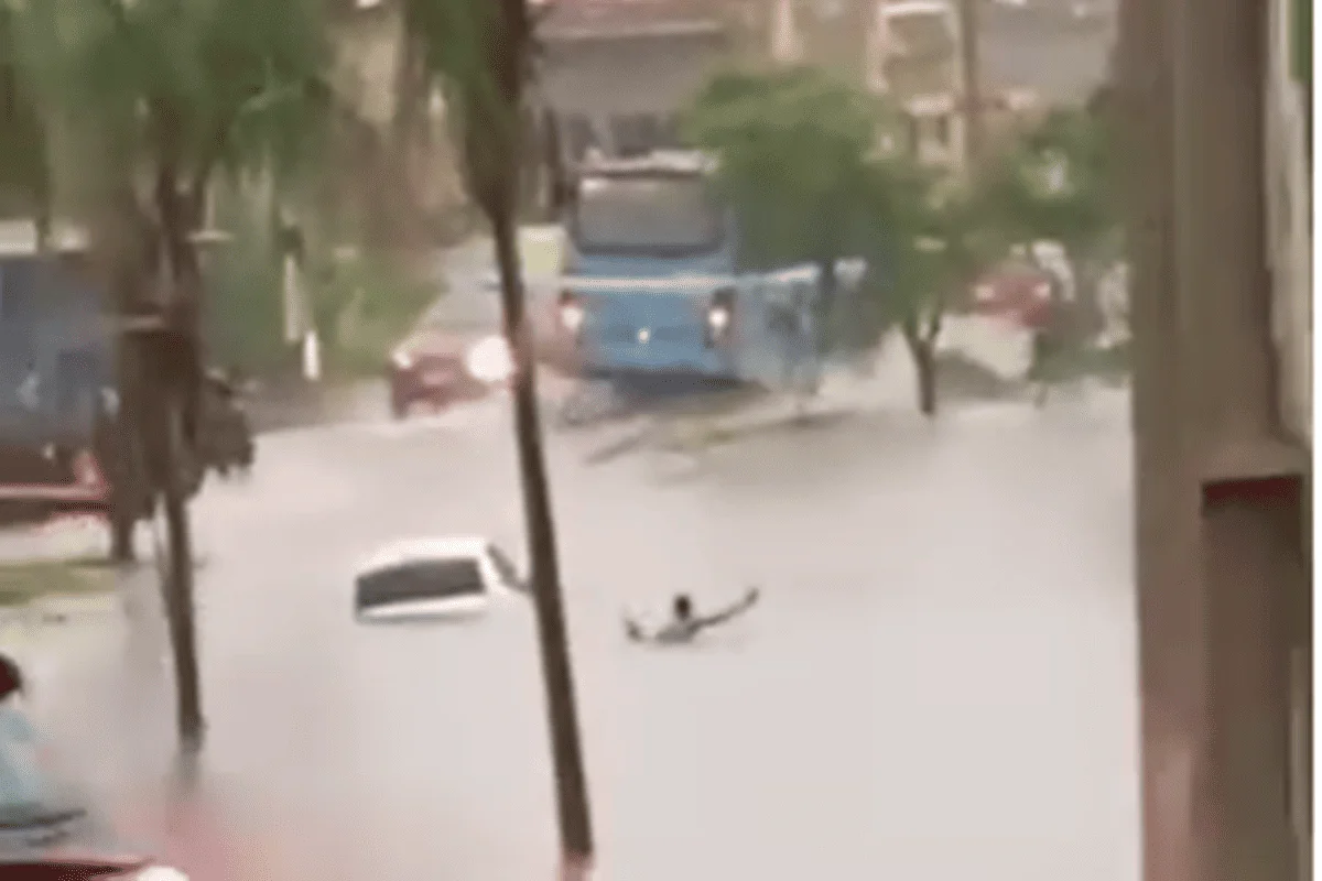 Nas imagens, o motorista abandona o veículo no meio da via completamente alagada e passa a nadar para conseguir atravessar o trecho inundado.