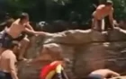 Quando ela se aproxima, o homem salta em direção a ela e a agarra. Durante cerca de três segundos, a mulher luta para tentar se desvencilhar, até o momento em que consegue e sai correndo do local.